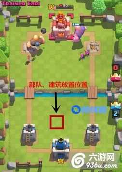 将部队放置在图中所标注的位置,这样王子会被部队位置吸引,然后往中间位置冲去,因为这些部队数量比较多,所以王子需要时间去杀敌,这时候中间位置会受到2个箭塔的伤害,轻松搞定骑士。