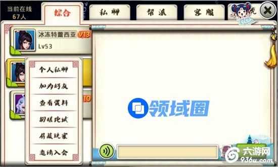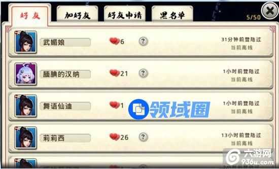 显示玩家拥有的所有好友,上限 50名。功能:聊天、查看资料、切磋比武、邀请入会、查看好友度。