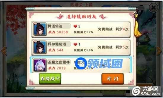 通过该界面,可以选择一名助战好友协助战斗。如果好友不足,则会在游戏玩家中随机选择玩家出现在援助好友列表之中。战斗中,协助技能只能使用一次。