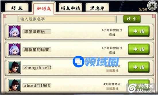 列表之中随机刷出游戏玩家,可以点击申请进行好友申请,得到对方同意后就会成功添加对方为好友。通过上方的搜索栏,可以查找到指定的玩家。