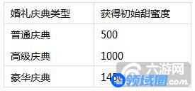 (1)双方初始的甜蜜度为庆典结束时的甜蜜度,若不举行庆典,初始的甜蜜度为0,若举行庆典,则在庆典结束后根据庆典类型赠送不同的甜蜜度