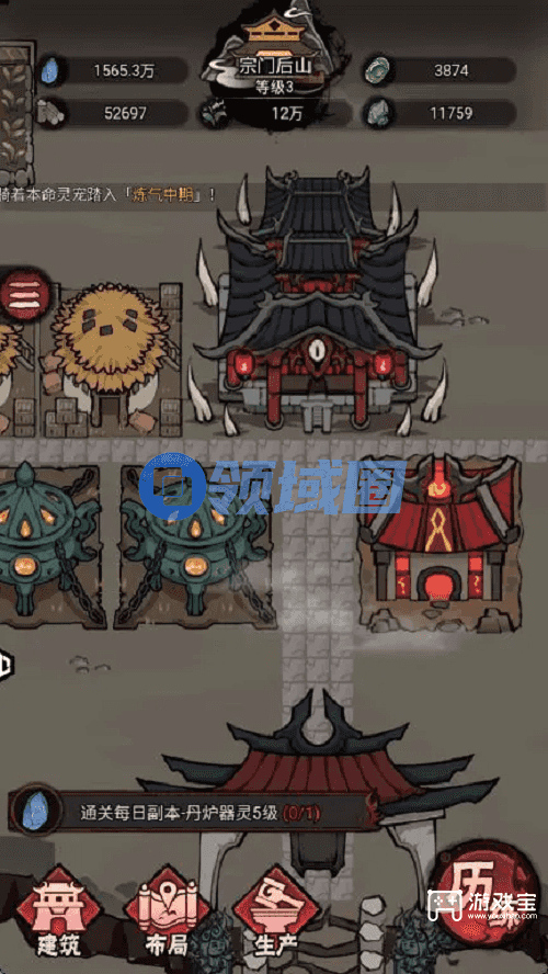 4、境界够的情况下,优先提升宗门大殿等级。升级建筑需要的木材以及矿石都需要宗门等级才能建设。建筑等级高才可以练高阶丹药。