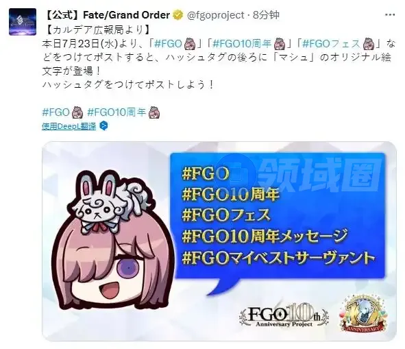 然后就是今年的推特周年表情也公布了,在推特输入以上的几种tag就会在后面出现小表情,今年是玛修和芙芙。