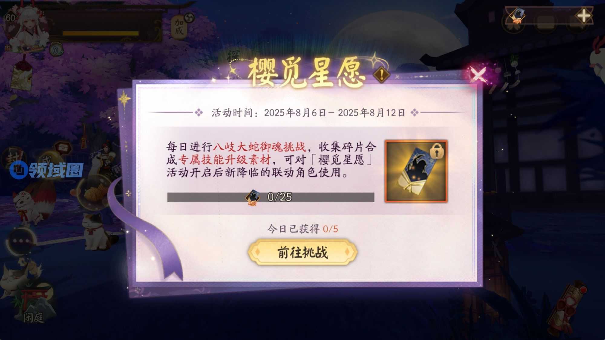 ※活动期间,每日进行八岐大蛇御魂挑战,取得胜利后有几率掉落专属于即将降临的新联动角色的「(限时)专属技能升级素材碎片」,每日最多掉落5枚碎片,活动期间最多掉落25枚。