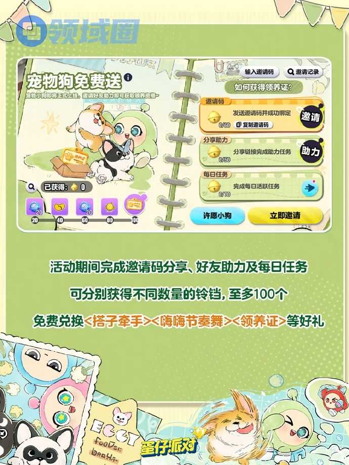 7月31日中午12点起,邀请好友助力、完成活跃任务均可得<宠物铃铛>积分,收集100枚<宠物铃铛>兑换你的毛孩子<领养证>。