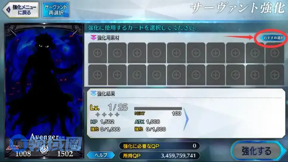①在【从者强化】界面中,追加自动执行可一并选择强化素材的“推荐选择”功能。