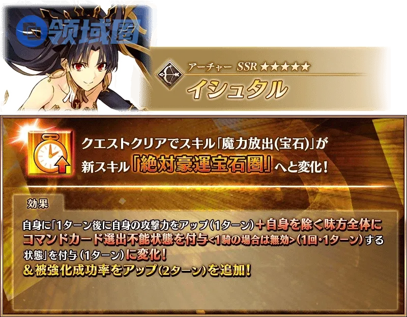 伊什塔尔本次强化的是3技能,【魔力放出·宝石】改为【绝对豪运宝石圈】,追加1回合后自身外己方全体指令卡无法选出状态1次·1回合,提升20%被强化成功率2回合。