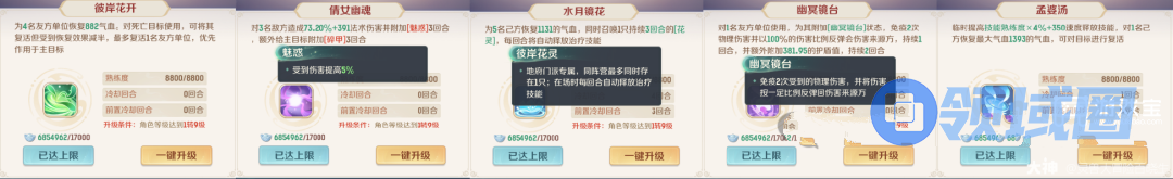 主要恢复技能,也是地府的核心技能之一!治疗量只和技能熟练度、装备宝石天赋等增加的治疗有关系,和法伤无关