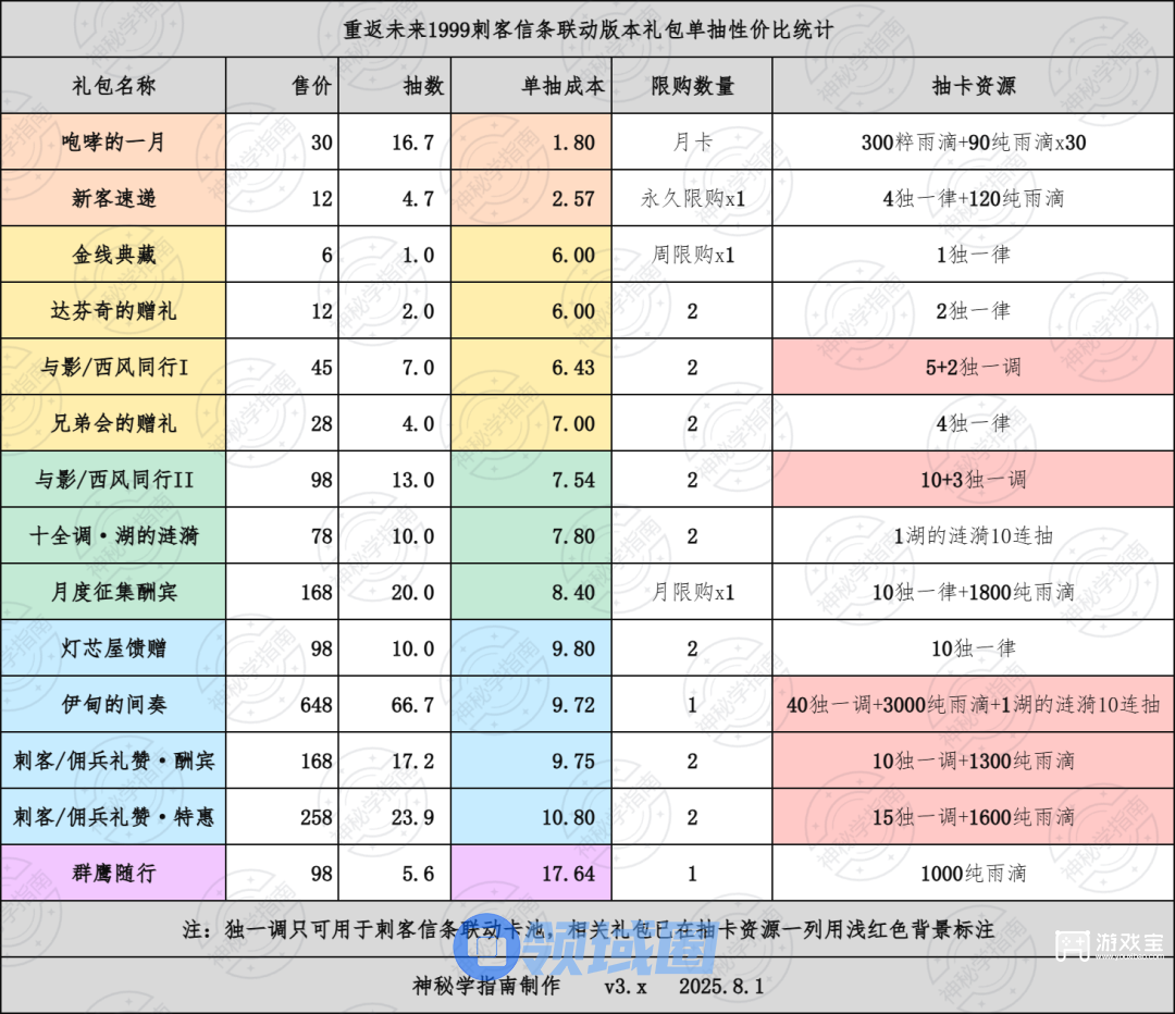 新客速递:售价12元,共可获得纯雨滴*120、独一律*4,单抽成本2.6元,仅次于小月卡。