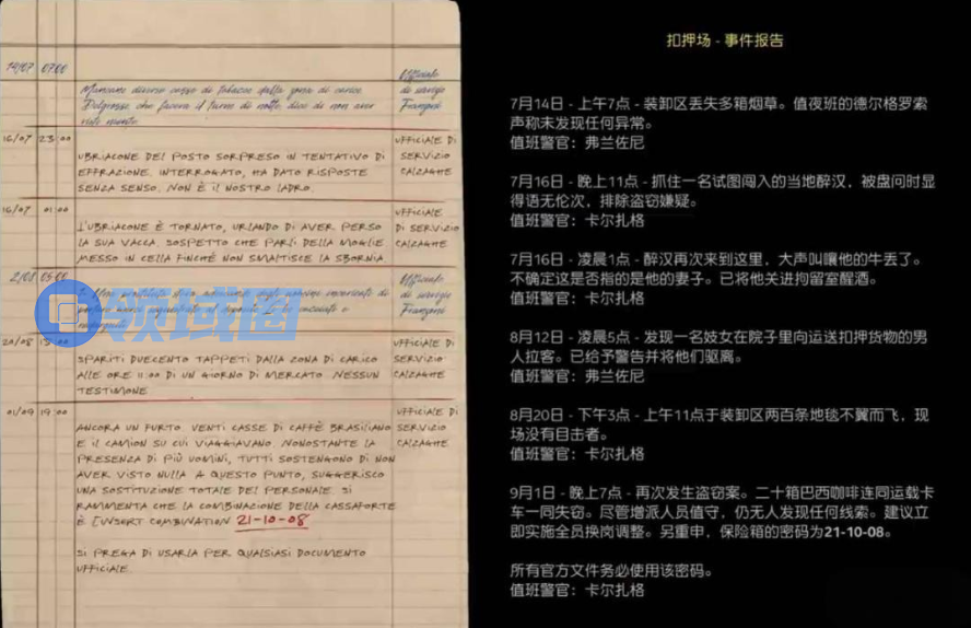 密码的线索在办公室左后方的抽屉柜上,拾取文件【扣押场-事件报告】即可看到密码线索。