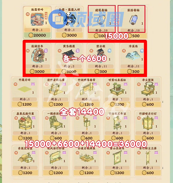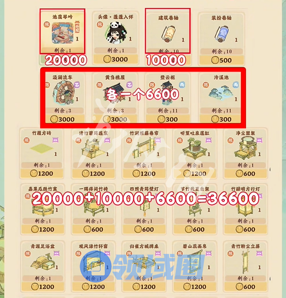 2、购买外观、10个建筑卷轴、乙丙建筑各一个,共36600游戏币。