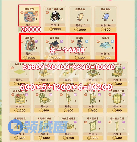 2、购买琴合外观和乙丙建筑后,剩余10200游戏币,可购买5个600的家具,6个1200的家具。