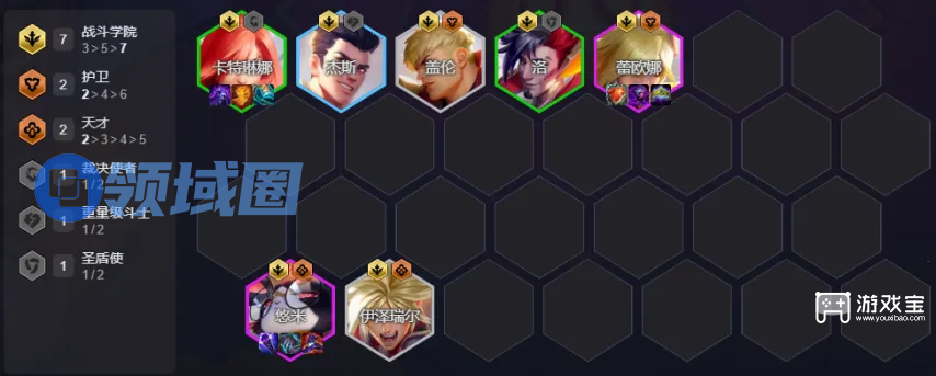 1、核心棋子:卡特琳娜(主C)、洛(主T/辅助)、悠米(副C/辅助)