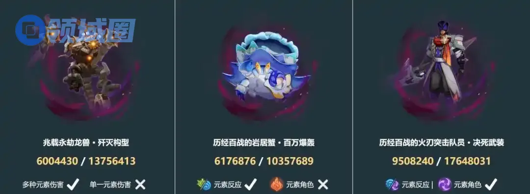 首先后续幽境危战的怪物安排如下,第一位是纳塔的地方传奇,之前不少玩家应该都已经挑战过了,然后后面两位的话都是新的boss类型,他们的机制其实一个是利好于绽放以及月绽放反应,也就是绽放锅,而另外一位则是利好与感电和月感电反应的。