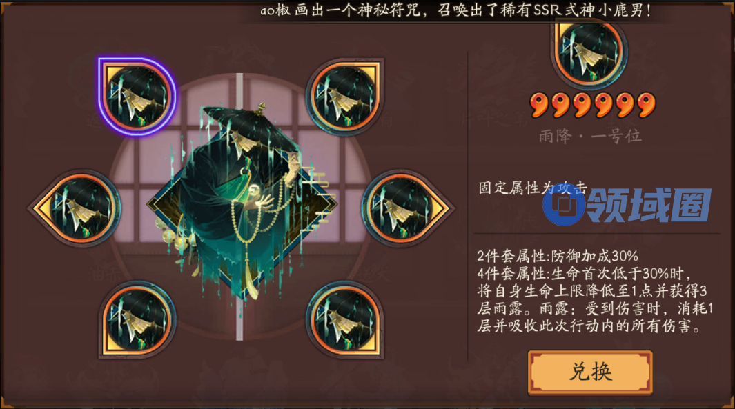 4件套属性:生命首次低于30%时,将自身生命上限降低至1点并获得3层雨露。雨露:受到伤害时,消耗1层并吸收此次行动内的所有伤害。