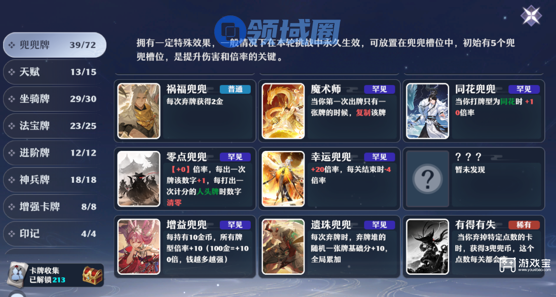 前期可以用福缘兜兜(进入关卡时随机生成两张普通兜兜牌)、有得有失(当你弃掉特定点数的卡时获得3兜兜币,这个点数每关都会变)等卡牌过渡。