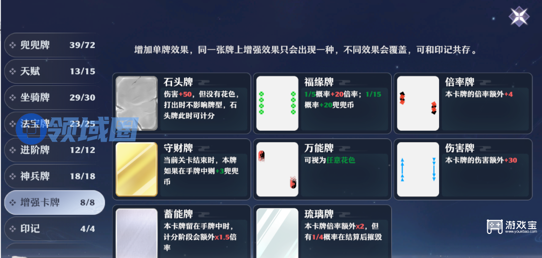 还有其他能增强的卡都可以无脑用,比如福缘牌,倍率牌,璀璨,炫彩等等,只要没有负面效果都能给目标卡牌上(概率摧毁的不要用)。