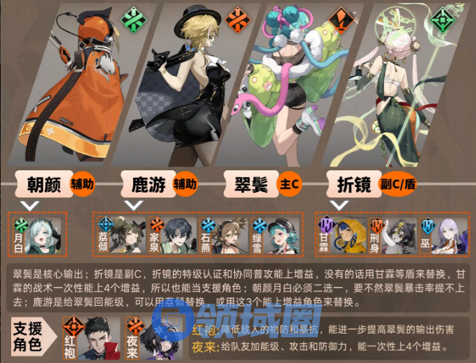 作用:折镜的“特级认证”和“协同普攻”可以为翠鬓提供增益效果,进一步提升输出能力,如果没有折镜,可以用甘霖、刑身或巫等盾角色替换,甘霖的战术技能一次性能上4个增益,也能作为支援角色。