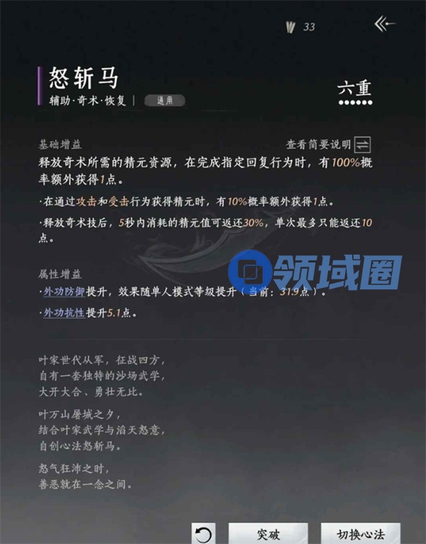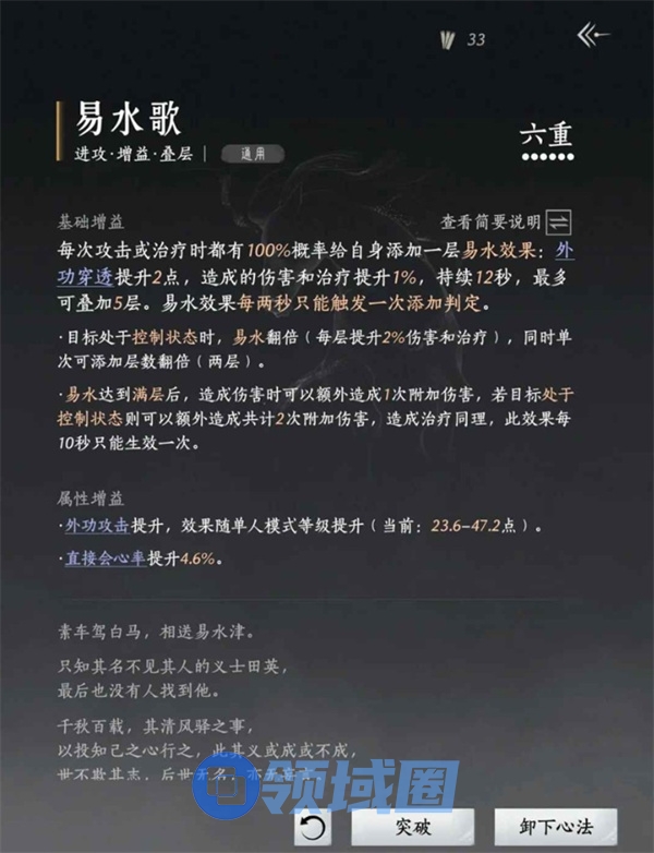 易水歌与霖伞联动,能保证易水层数全程满,提升奇术输出能力。怒斩马提供精元支持,是释放奇术的前提,最好六重,重数越高越稳定。