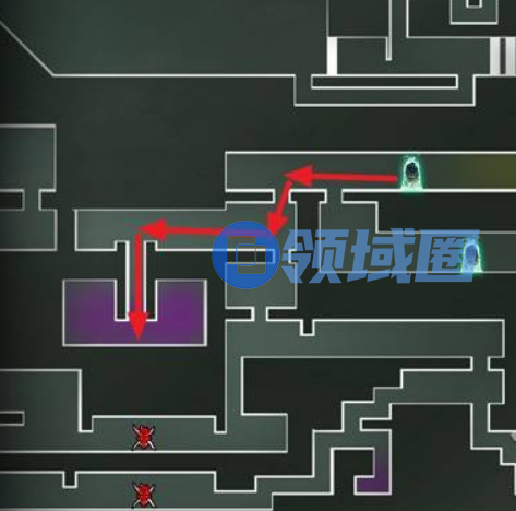 传送至石碑【西实验室】,沿红色箭头前往紫色房间。