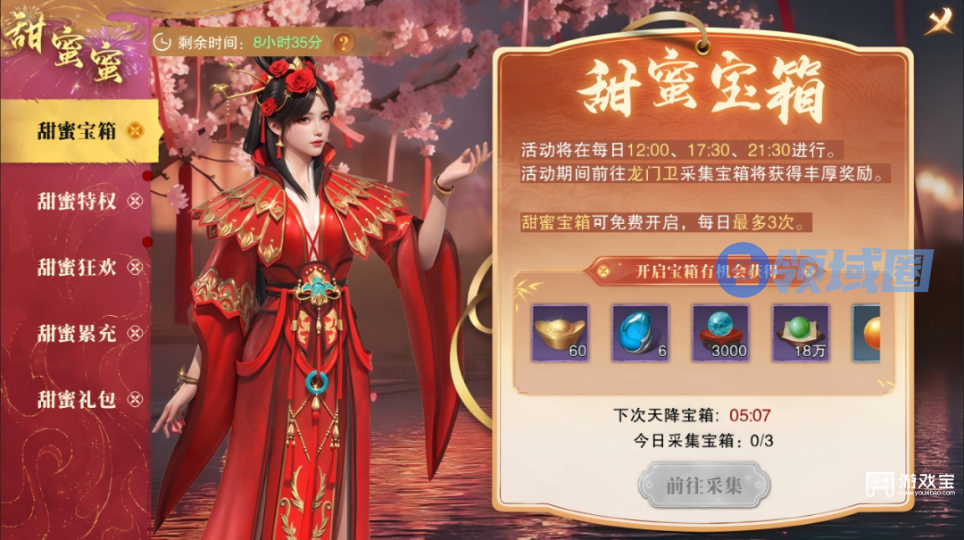 活动期间内,每天12:00,17:30,21:30在龙门卫刷新甜蜜宝箱,持续2小时,拾取甜蜜宝箱可获得惊喜奖励。
