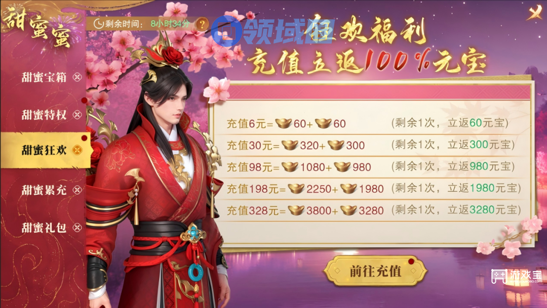 活动期间,充值6/30/98/198/328元,返还等额元宝,仅1次机会。需在充值界面的充值档方可触发返还。
