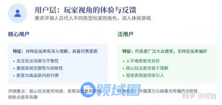 - 核心用户:即有一定游戏品类经验,并且会为游戏付出时间/精力/金钱的玩家,这类玩家的视角会更具有代表性,这就跟一个擅长吃西餐的人更能够评价西餐一个道理。