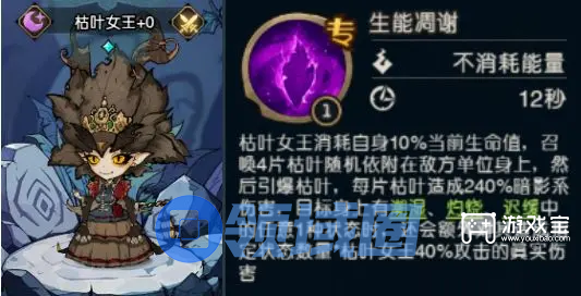 枯叶女王针对附带灼烧、潮湿或者迟缓状态的敌人时,伤害会增加40%,当然也可以围绕枯叶女王去设置能制造负面效果的两个森灵,从而提高枯叶女王的输出。