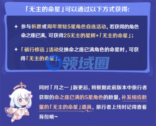 当玩家通过祈愿或周年常驻五星自选活动获得的角色已满命时,会自动获得25无主的星辉+1枚无主的命星。