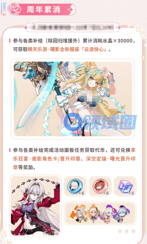在活动中玩家可以获取一个周年庆的专属礼盒,在周年庆期间累计消耗达到指定数量的水晶,就可以免费领取一个松雀泳装皮肤,皮肤有着非常美丽的夏日氛围,此外在游戏中还上线了多个限时的主题活动,每个主题活动都有独特的玩法,完成这些活动不仅可以获得各种限定皮肤和外观,还可以获取水晶和各种角色的养成材料,有些活动会有剧情章节,可以通过参与到故事中去了解到游戏世界的世界观。