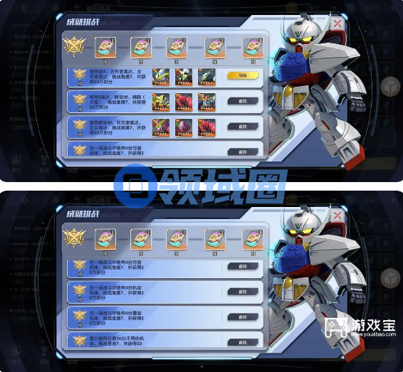 成就挑战前三个需要上特定机体完成的挑战,我们除了必须要求出战的三个机体外,剩下两个位置可以选Z高达(觉醒)、、翔翼型强袭高达。这两位配合造成的伤害,足以完成积分要求。