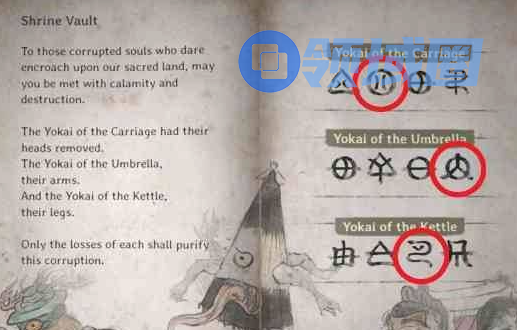 查看神社悬挂的绘马,找到带有妖怪图案的绘马,参考下图从左到右分别是瓶长、伞妖和轮入道。找到之后按住L1键再按下×键翻转,找到正确的符号,符号会记录在手帐中。每个绘马上有4个符号,需要参考妖怪的线索找到正确的符号。