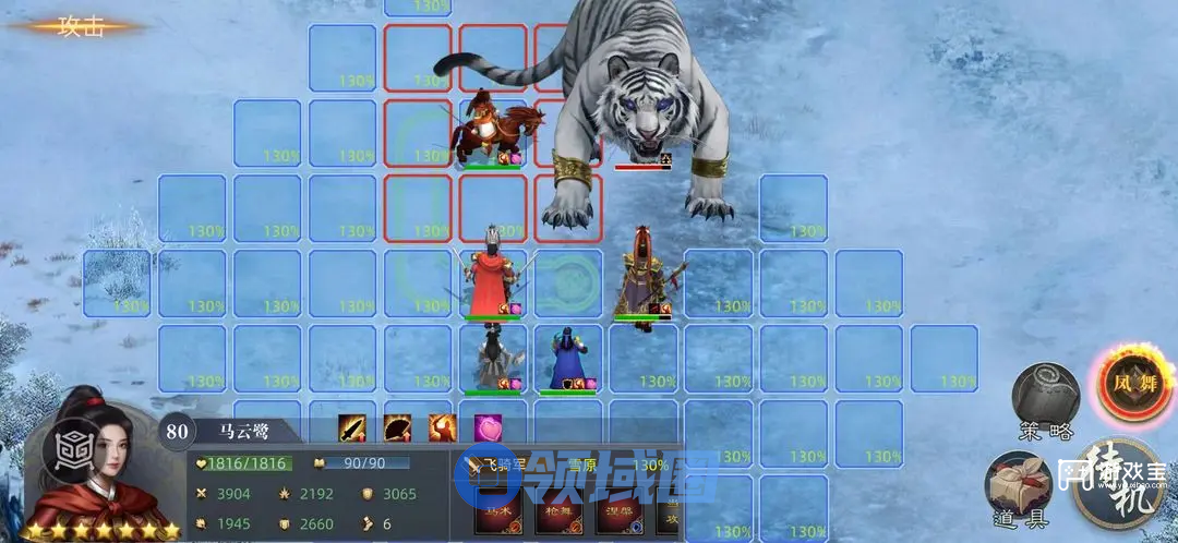 白虎6:第一回合,刘备走到白虎左下角给马云鹭加攻,马云鹭上前一枪,于禁向前射两下,貂蝉给马云鹭回归,马云鹭再砍一枪,吕布上前一抢,走位如上图。第二回合,马云鹭一枪,于禁射两下,吕布再一枪,貂蝉群加防,刘备看着给加血。第三回合,马云鹭大招,白虎的仇恨标记应该是在马云鹭身上的,其他人看着打。建议前期不要给马云鹭加血,让其先挂一回,复活后增加伤害。另外关键点是扛白虎大招的时候,记得让于禁在马云鹭旁站位。按上述的武将属性装备和打法,可以一次性过白虎6。