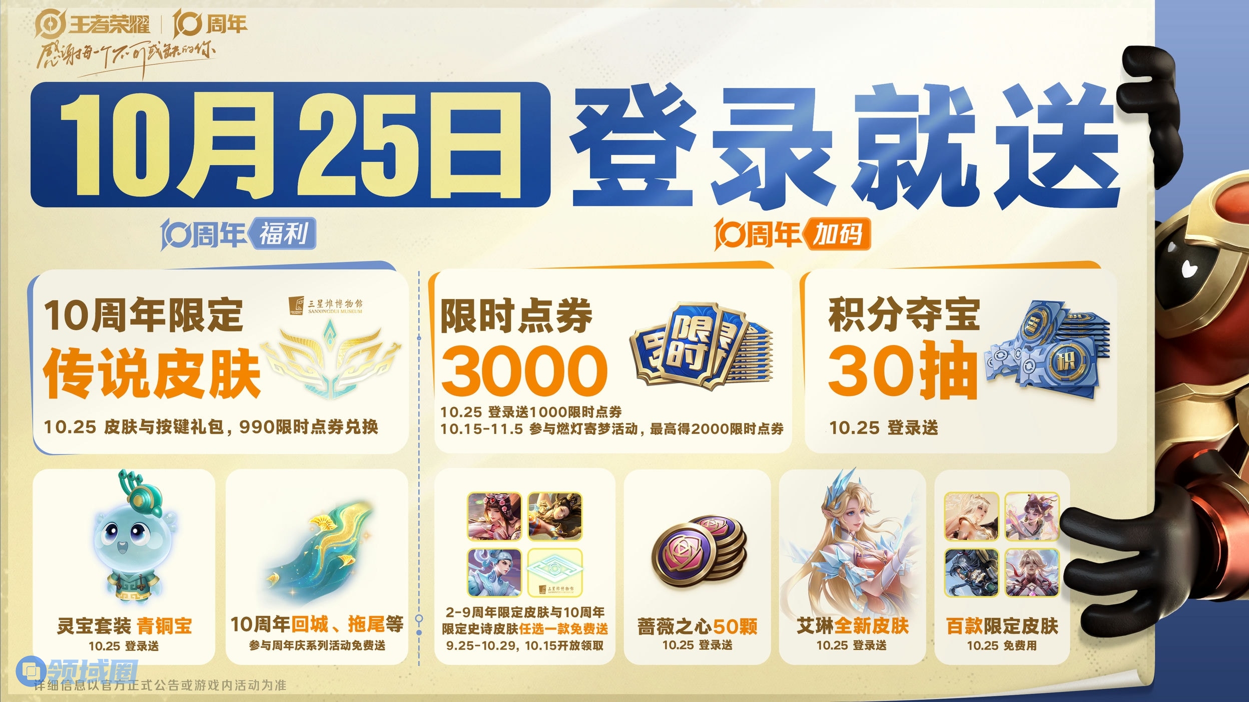 以上就是关于王者荣耀十周年庆有什么福利的全部内容了,希望能为各位玩家们带来帮助,想要了解更多游戏攻略及资讯请持续关注领域圈游戏。