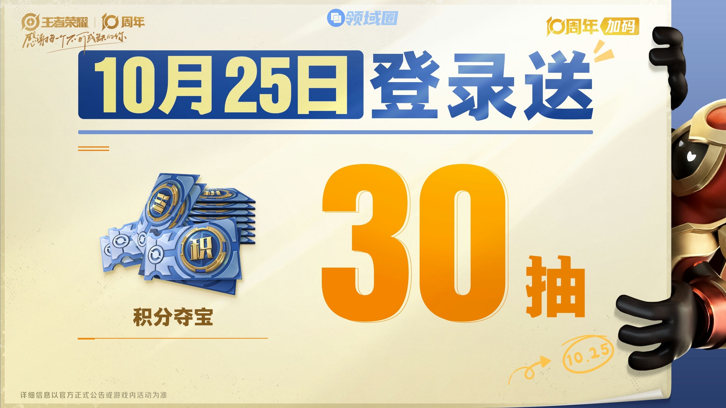 福利3:【十周年福利加码】送积分夺宝30抽:10.25登录就送