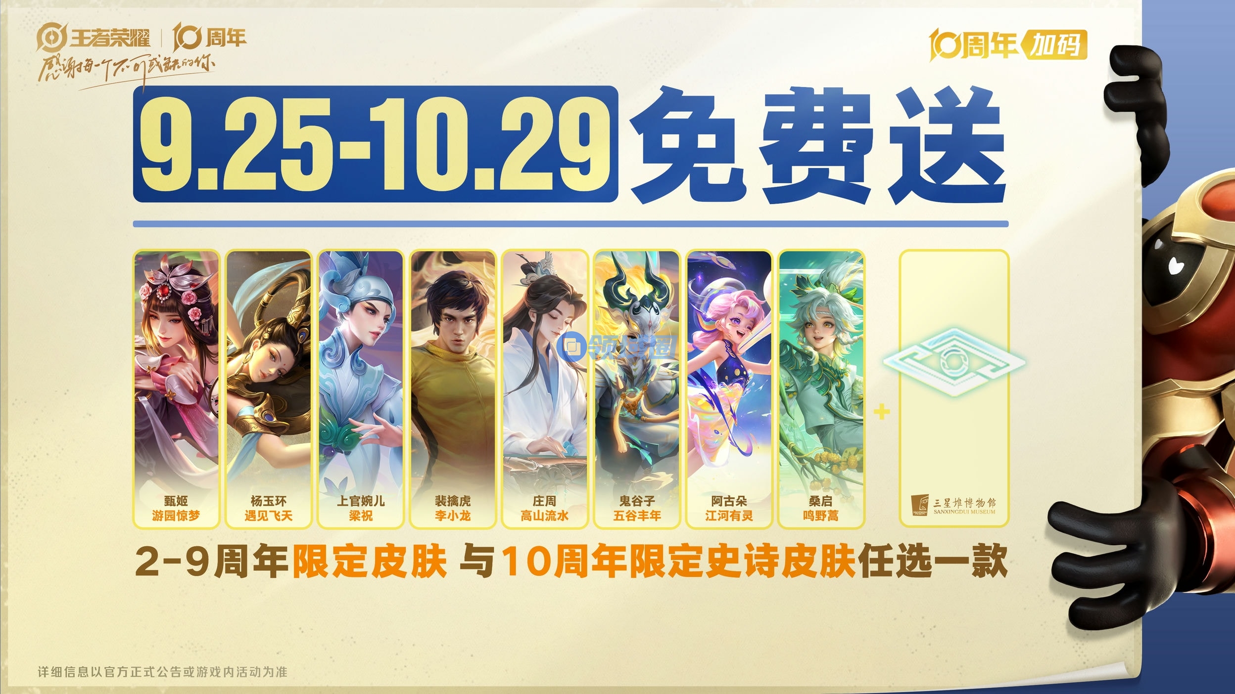 福利9:【十周年福利加码】送2-9周年限定皮肤与10周年限定三星堆主题【史诗】皮肤:任选1款免费送,目前活动已上线,10.15开放领取哟