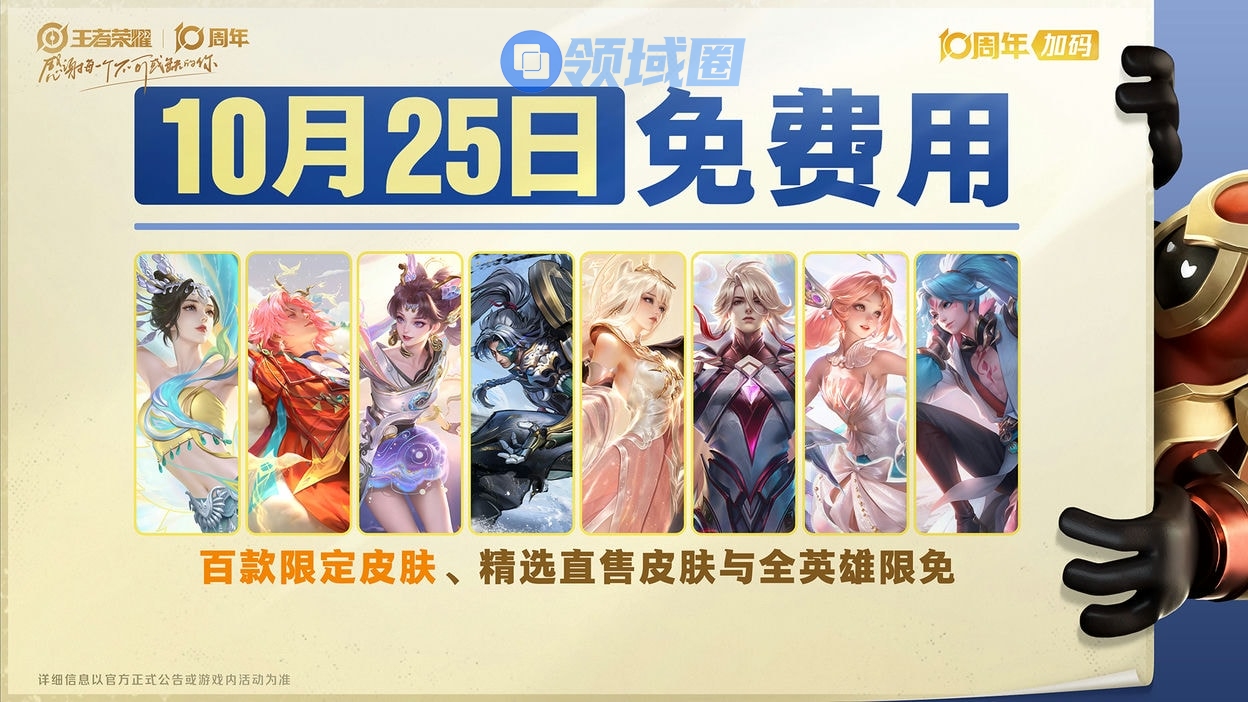 福利8:【十周年福利加码】百款限定皮肤、精选直售皮肤与全英雄:10.25限免