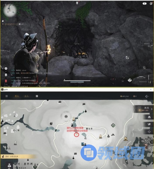 4、再前往下图位置,使用火箭射藤蔓,进入洞中在箱的旁边捡起绣着邪字的奇怪钱袋;