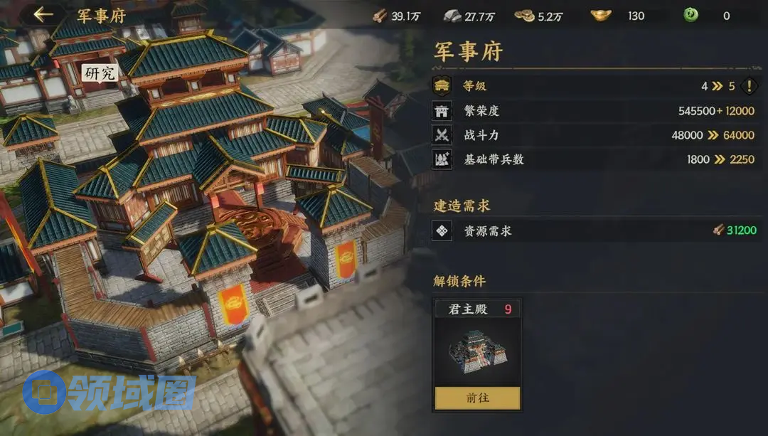 2、优先升君主殿8级(解锁军事府)、校场2/7级(上阵副将)、士兵营9级(二阶兵种)。