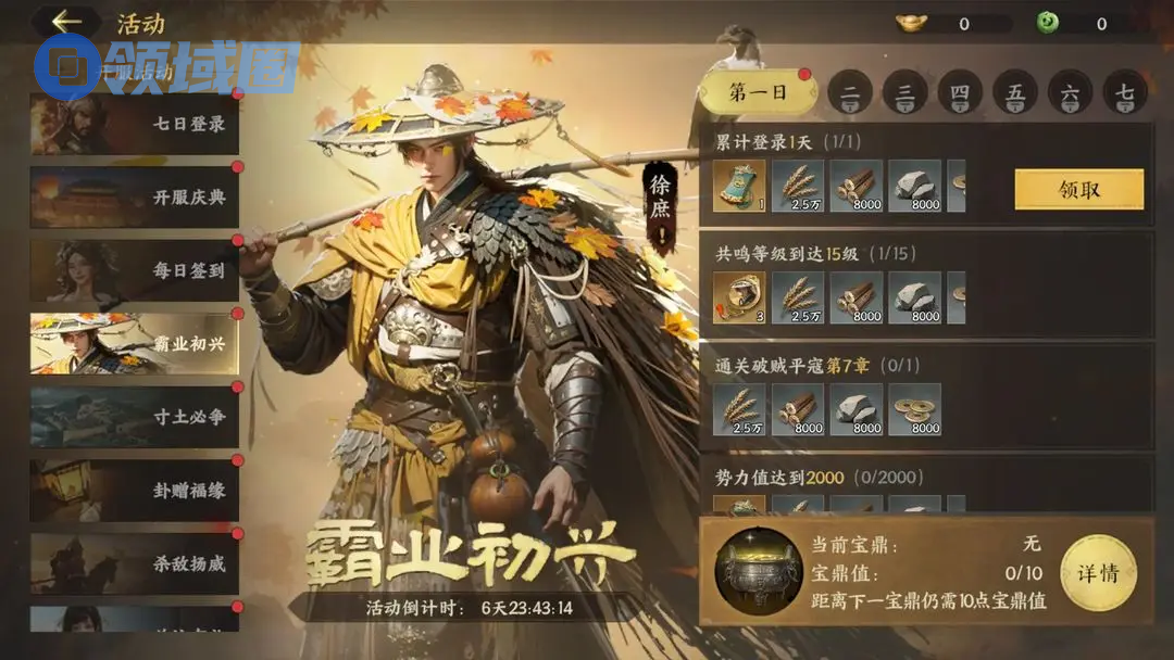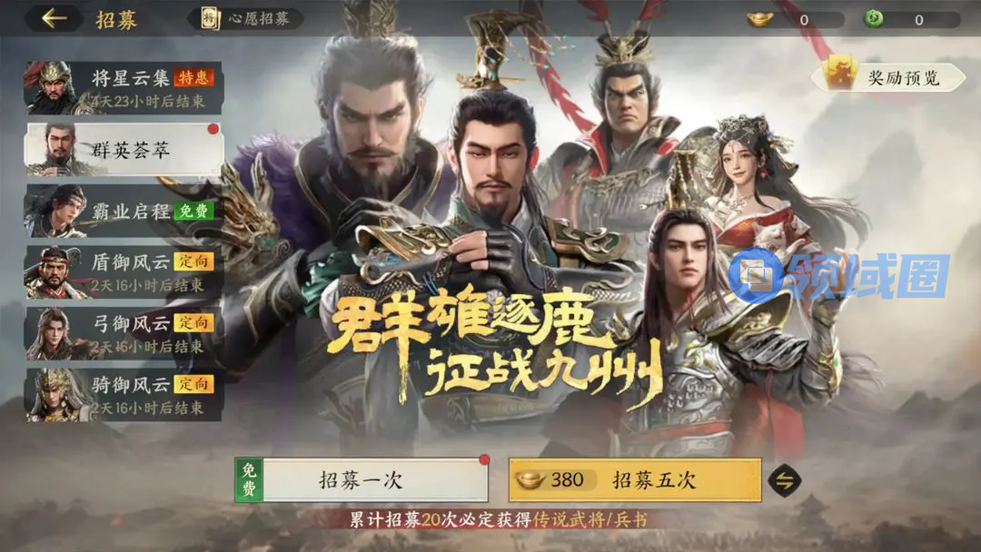 4、霸业初兴:完成活动最多可获得1200元宝与85抽“募杰令”,更能获取3红武将徐庶及其专属兵书!