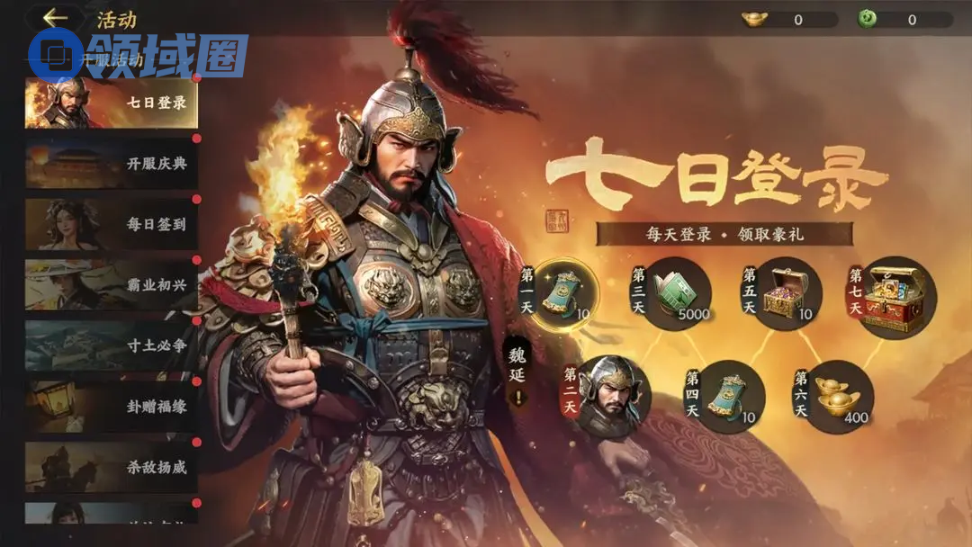 2、七日登录:累计可领400元宝与20抽“募杰令”和强力武将魏延以及兵书自选宝箱·精良*1。