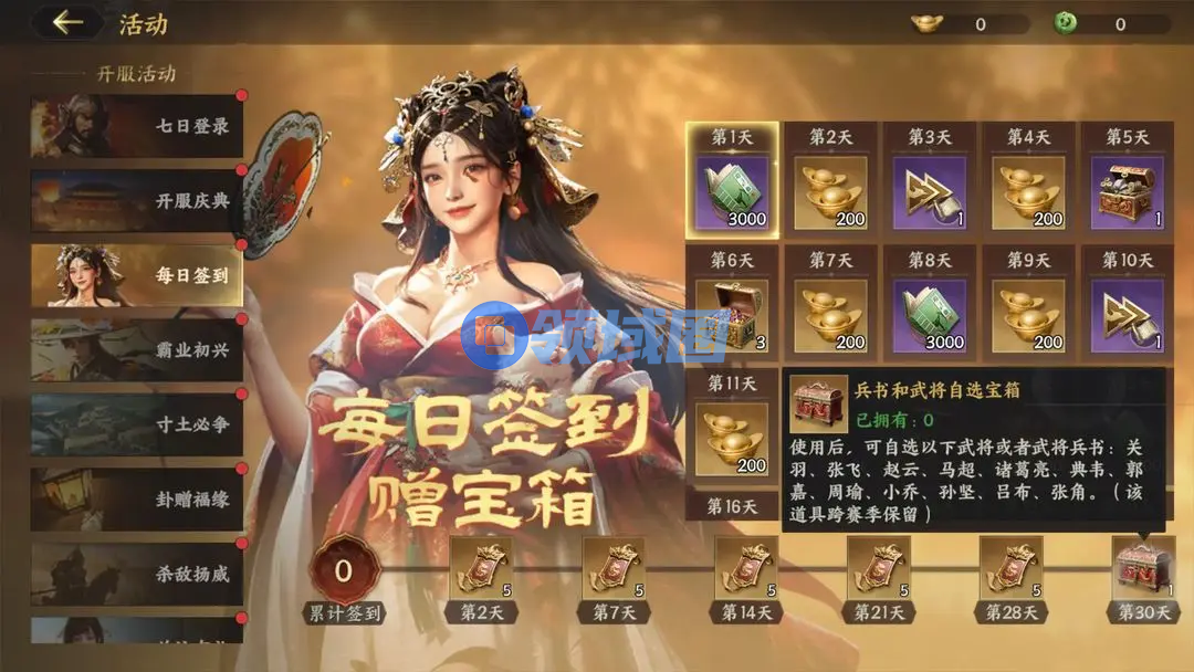 3、每日签到:累计共可得3000元宝与25抽“募杰令”,签到30天时还可额外获得核心武将/兵书自选宝箱*1.
