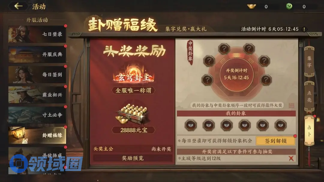 5、卦赠福源:战胜资源地守军、讨伐青州贼或每日登录,均可获得卦象道具。达成要求保底可得50抽“聚义令”与800元宝,更有机会争夺全服唯一玄穹卦主大奖——28888元宝!