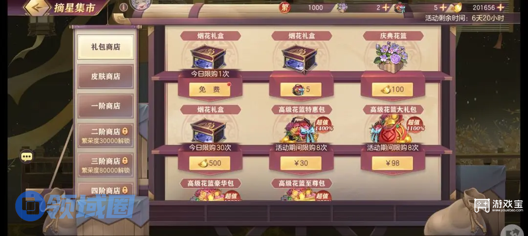 3、这边的话提醒一下,就是不要把花高级花篮去买这个烟花礼盒,烟花礼盒只用元宝买,而且包括新区如果特别缺元宝,比如刚开始曹丕幻想服,不建议大家去花元宝搞长安,因为这个元宝对你们来说是很稀缺的,嗯,当然老区的话这边也是高级花篮也是换各种碎片的,除了氪佬去开更多的层数,需要用高级花篮去买烟花礼盒。