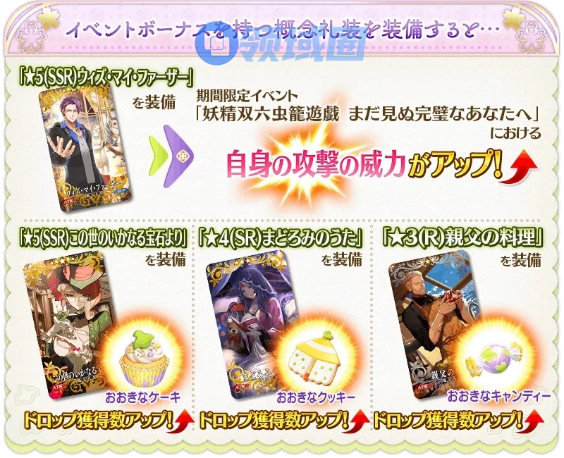 以上是本次活动的礼装加成,活动赠送礼装是攻击威力提升效果,卡池礼装对应3种商店材料奖励。