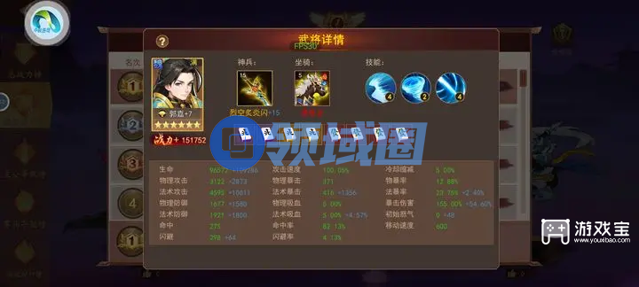 11、然后就是第二天继续跟着主线走就到了15章。第三天一样买神器,弄坐骑,抽令牌。 运气不差郭嘉能+6。神器也能整到一个将就+15的。精炼和重铸一下。这半成品郭嘉能带着推到16关。然后就摆烂卡着了。如果前面郭嘉的神器属性是攻击和暴击三属性的。那后面签到自选神器选华佗的3暴击+15的。