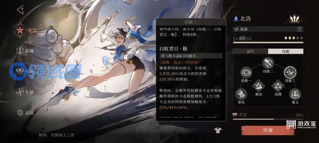 3、北洛(输出首推):核心原因是其 “强度碾压”—— 作为 6 元首充角色,内测中是 “数值怪”,三冠北洛的伤害可打平四冠限定 up 冰龙,且操作难度适中,能快速提升开荒期的输出能力,帮助高效通关爬塔和高难本;