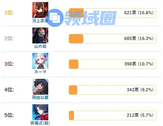现在冠位最多的是河上彦斋,得票数为621,河上彦斋可以算是本次冠位战的最佳输出人选之一,虽然机制上有个特殊战续,但是点了冠位树之后可以通过暴击即死,河上彦斋的暴击能力也是非常优秀。搭配近期唠唠叨叨活动的剧情加成,算是热度和强度共存了。