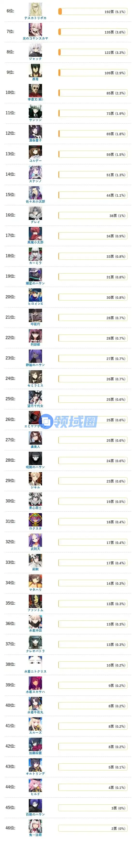以下是剩下其他从者的得票情况: