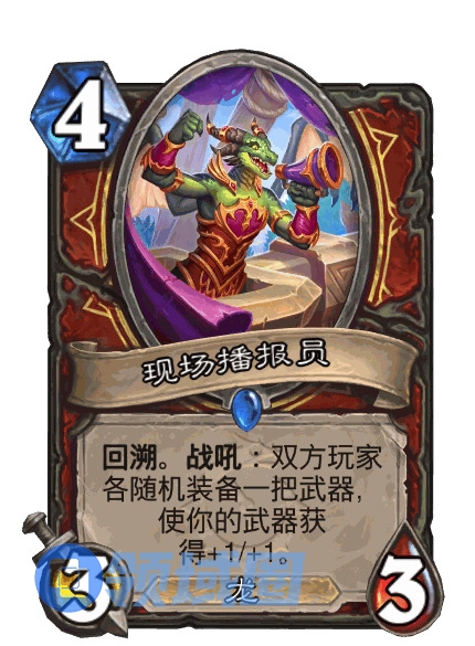 回溯。战吼:双方玩家各随机装备一把武器,使你的武器获得+1/+1。